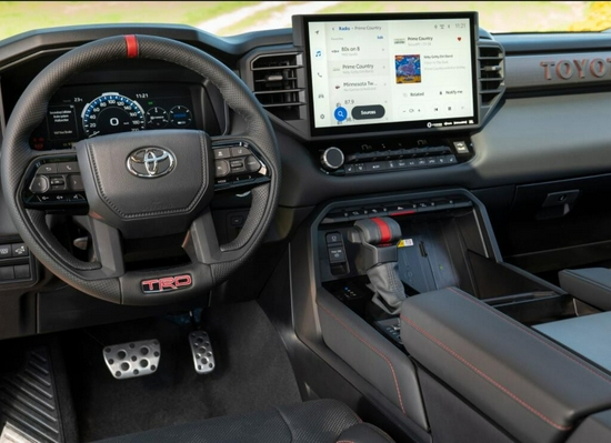 全新丰田坦途皮卡车内饰科技氛围已经相当强烈了,不仅有全液晶仪表盘加持,而且提供了超大面积悬浮导航屏幕,视觉效果甚至能够媲美特斯拉,TRD高性能版本更是提供了丰富的内饰装饰,比如红色真皮面料座椅,搭配有专属刺绣装饰。
