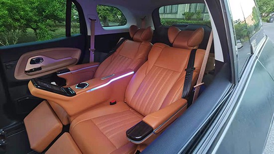 升级过后采用的是和前排不一样的颜色,属于一个双拼色,现在很多国产车都流行这么玩法,皮质采用的纹路和原车的一样属于粗纹,用的是纳帕皮所以手感上较为原来的会细腻很多,海绵上要比之前柔软一些,原来的中排座椅比较薄,所以做不出柔软和座椅包裹性,对于乘车体验来说会降低舒适性。