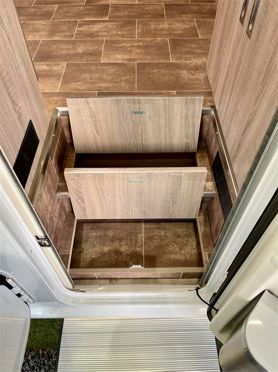 进门处是非常的明显,他做了双层地板,所以有两个储物空间可以当做鞋盒使用,储存6至8双鞋子。同时,在双层地板的中间放置的是两个150升的,共300升的清水箱。