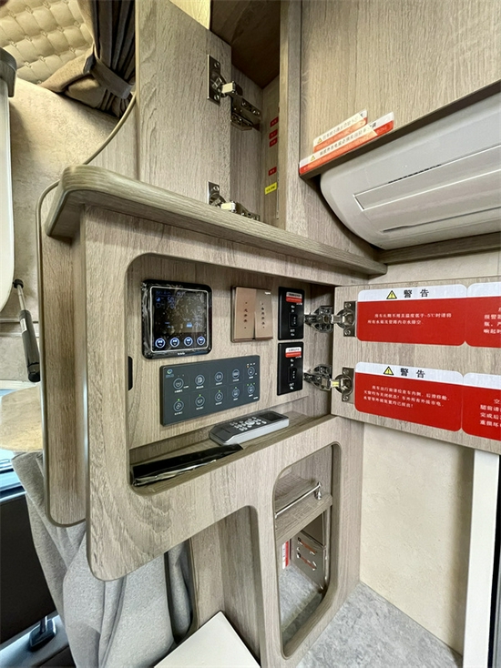 外部配的是燃气灶燃气管,以及外接的淋浴头和花洒,这些都是房车必备品,其次就是在厨房的操作台的位置,有一个双向的抽屉,非常方便,车内和车外能够同时使用,方便了生活。