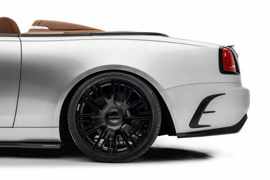 侧身部位MANSORY尽可能保留了曜影原本的精简干练风,但作为无碳不欢的“碳纤之王”,MANSORY依旧对翼子板、侧裙、A柱覆盖装饰件、后视镜罩、可折叠车顶棚、出气口分流器等部位进行了“碳化”处理。令人意外的是,就连分布在曜影前翼子板两侧的雕刻徽章标志,也全都用带底漆的可视碳纤维材料作了更替。在MANSORY的定制理念里,不论多容易被忽略的微小部件也都足以成为彰显品牌魅力的优秀“载体”!