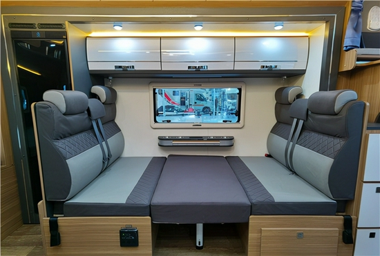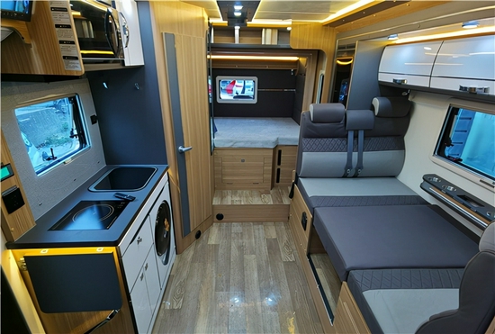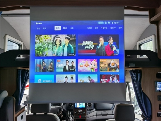 内部采用的是灰色的设计风格,同时布局简约明了一点也不繁杂;上门处右方是电器集成控制面板与物理按键方便我们的日常操作。额头区域设有额头床,足够两人日常休息使用,娱乐部分采用的是极米投影幕布和音响,带来了影院级的视听感受。会客区部分采用L型沙发卡座设计,在有需要的情况下可以拼成沙发床,空间利用率十分合理,厨房区域配置齐全,配有电磁炉、洗水槽、微波炉、冰箱储物柜等。