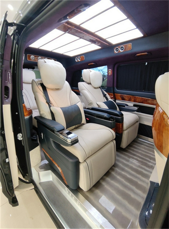 这是奔驰威霆高顶单开门的版本。高顶威霆具有超大的空间,车内顶部宽敞,加高的14公分顶部也是由奔驰授权主机厂改造,出具的是单独的手续和合格证。这款在外观上采用的是经典大气的迈巴赫大包围,包括立标也做了更换。奔驰商务在同类型商务中对比,空间感非常占有优势。而威霆作为奔驰的品牌的一个系列,品牌度也深入人心,不管是公司接待或者是家庭用车,都能称得上既有面子,也有里子的车辆。
