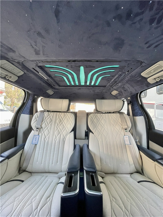 2021款别克GL8“雅典娜”改装版车辆内饰主打简约商务风,该有的功能2020款GL8上都有配备,简约不减配,保证用车舒心。这款GL8在顶部全是做了鹿皮顶的升级与处理,在顶部做了多色可调节的八爪鱼式顶灯,搭配后方的星空流星顶,更加突出它的华贵高端的气质。