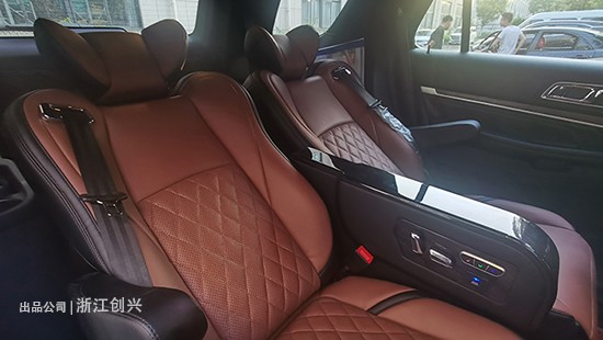 另外座椅除了靠背可以调节外还有电动前后移动和电动腿托功能,加起来一共六项调节,颜色方面和原车的没有色差,周末放假或者节假日一家人去野外郊游看看祖国好风光的时候或者长途行车旅游躺在后面的沙发上开启按摩、打开腿托闭眼休息来上一段每秒的音乐是多么惬意的事情。