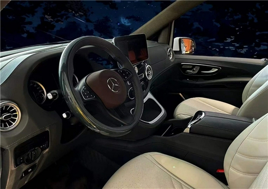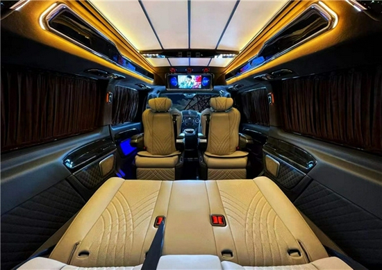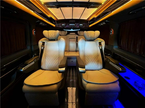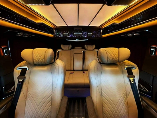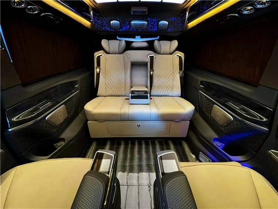 拉开电动舱门,全车豪华游艇级内部装饰,高级实木迎宾饰板,尽显尊贵!内饰风格依旧保持奔驰商务车的豪华质地,座椅均由进口澳洲小牛皮包覆,全车豪华柚木与乌木装饰--至臻奢华。高档电动调节对开天鹅绒窗帘充分保护隐私,进口意大利阿尔坎塔拉麂皮绒顶尽显品质。