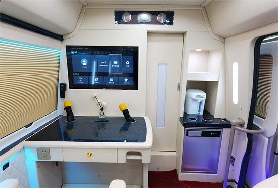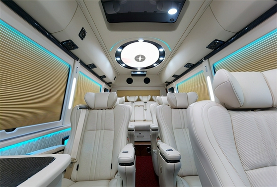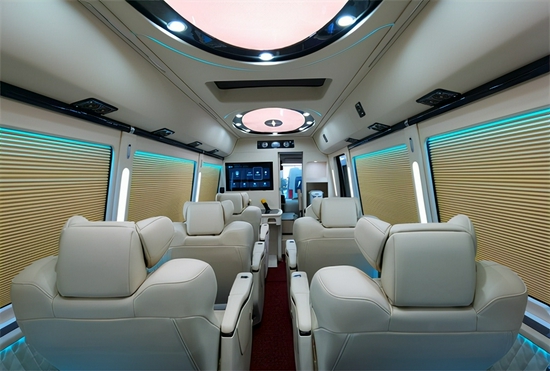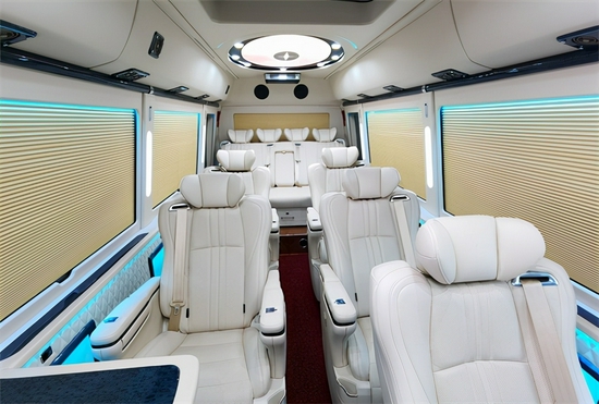 另外全新配备张的高档OTTOMAN意大利真皮航空座椅,并配置了电动脚托、电动靠背平躺。让嘉宾享受飞机头等舱般的旅途享受。航空座椅前设计一张真皮汇报席办公桌,桌面配以多媒体数据转换接盒,实现多功能的移动办公与会议展示。
