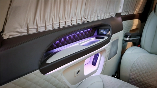 内饰对于大多数商务接待车来说是公司的形象与颜面!空有大气的外观和响亮的品牌,有时候和空有一身美丽的皮囊,而没有内涵的美女是一样的!因此,内饰改装势在必行,使其符合高端商务车的定位,成为众望所归!来到车内,威霆的原车低廉感已经不复存在了,全车大量使用真皮包覆,柔软舒适,高级感十足。中控换上了12.1英寸的大屏,内置360全景影像系统,平时倒车也不怕蹭到了。加装了带有车载冰箱的多功能扶手箱,夏天很实用的配置。