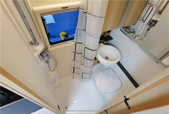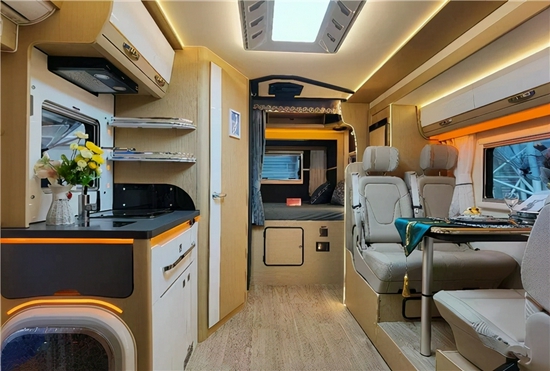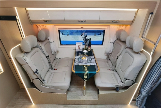 会客区采用对坐式卡座沙发设计,北欧风格的室内设计理念,搭配一张可升降式餐桌,临时可拼成一张沙发床,提供了更多的休息空间。会客厅上方有着一排储物吊柜,方便日常使用。后方则是一台152L赛特福德房车专用冰箱,用以存储食品,排气扇进一步增加了车内的空气流通性。顶部氛围灯营造出了温馨的家庭氛围。