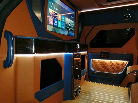 六座乔治巴顿车体内部结构 前后舱时尚设计 超大电动隔屏,40寸超薄显示器 整车座椅数 6座 驾驶区主要配置 驾驶室车顶 高级鹿皮 地毯 原厂豪华地毯 乘客区主要配置 座椅 带加热、按摩及腿部支撑电动多向座椅 车顶探照灯 高级鹿皮及乔治巴顿标志 地板 全舱柚木地板 吧台 3D式设计、白色光带及氛围灯 座椅中央扶手 马鞍式设计带击沉触摸控制系统 空调系统 前后舱独立控制,度调节。