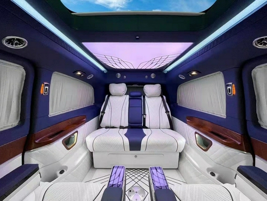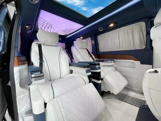 高顶奔驰V260级豪华多功能车的高品质内饰将为您打造一处家外爱巢。设计出色、外观独特的驾驶室,搭配拥有高品质的装饰材料。全景式滑动天窗为您带来更多光亮,令您更加贴近自然。利用 2 个温控双杯座或冷藏箱,您可以在旅途中随时享用温度适宜的饮品。夜晚驾驶更是一种享受,V 级车的环境氛围照明系统可以利用氛围灯带来无比舒适的照明效果。