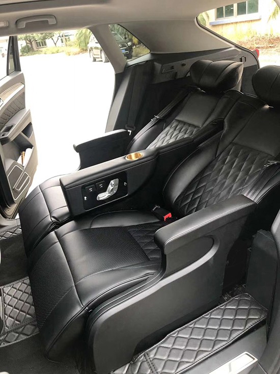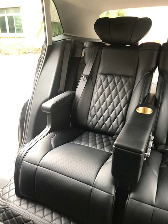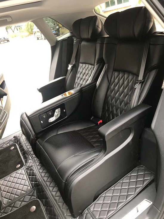 改装航空座椅后空间要比之前大很多,靠背可以躺倒下来还带有电动腿托,大的空间可以保证乘坐的不拥挤,这是舒适性上最重要的,航空座椅的海绵用的太空棉厚实柔软,皮料用的纳帕皮也是高档皮料有记忆回弹,乘坐上去的感觉就像是坐在一张大沙发上