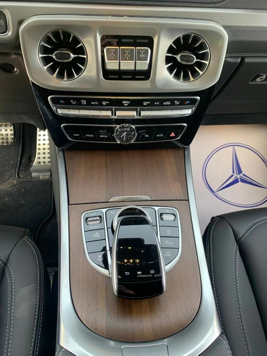 2021款奔驰G550车内采用深色调与桃木装饰,棕色真皮运动座椅非常舒适,方向盘以高档真皮包裹装饰,触感极其细腻。配有桃木装饰的操控台,稳重大气,同时提高了整体的质感。各种功能按钮应有尽有,丝毫不次于豪华轿车的功能。