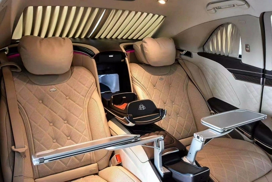 奔驰迈巴赫S680普尔曼防弹加长包括车门的内衬以及座椅全部采用了一种菱形格栅的结构造型之奢华让人赞叹!配置方面例如顶尖柏林之声立体音响,辅助,如此大的一款车竟然只是标配了四座的航空座椅,这其实并不是空间上的浪费,只是空间的再利用而且是完美的利用!