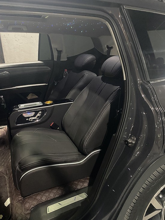 而中排方面由于途昂是七座车,空间很大,所以中排座椅可以升级成航空座椅,航空座椅除了坐的比原车舒服外还有多项的调节功能,分别是电动腿托、前后移动、靠背调节功能,另外中排航空座椅也带有通风、加热功能和座椅按摩功能,这点非常符合商务接待使用,客户坐在中排上就像坐在头等舱一样的感觉,带的腿托功能和靠背调节功能也可以让客户有更多的坐姿。