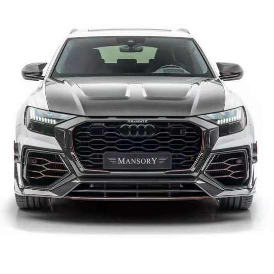 MANSORY为RSQ8重新设计的多边形网状格栅显现出强大的攻击性,搭配肌肉感十足的凌厉线条,一种不输“野牛”Urus的巨大威慑力跃然于表。MANSORY真爱粉都知道“流水的豪车铁打的碳”这个“梗”,从侧面印证了MANSORY每一次精妙绝伦的个性化定制背后都离不开对碳纤维炉火纯青的运用。RSQ8车头不论是:引擎盖、前唇、前保险杠、格栅框、进气孔薄片、大灯罩等部位都被MANSORY施予 与了大刀阔斧的“碳化”处理。
