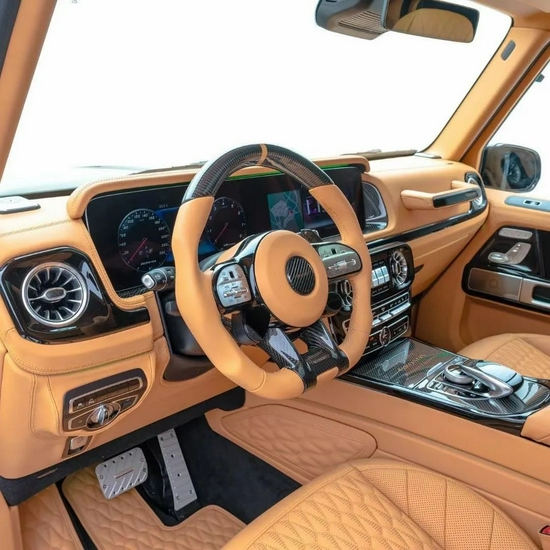 MANSORY G63 Gronos内舱随处可见的锻造碳纤维装饰件,为全车平添了一份不易察觉的赛车级运动氛围。加之座椅、车门面板、中控台、扶手箱、内壁、流星星空顶、后备箱地台等区域均精选Mastrotto小牛皮、Alcantara环保麂皮绒等上等皮料/面料,全车的奢雅精致感得到了史无前例的进化升级!外表粗犷灵动,内饰精益求精——MANSORY豪车“高定”,诠释的是100%匠心。