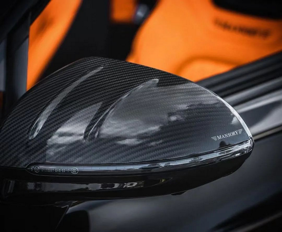碳纤维后视镜盖细节展示:精细的纹理编织将MANSORY迈莎锐传承三十余年的匠心工艺映衬得一览无遗。