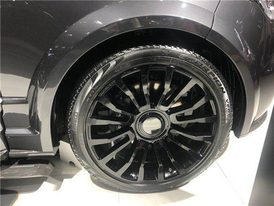 这台迈莎锐路虎揽胜加长版配备了个性十足的22寸全黑锻造碳纤轮毂,与275/40 R22大尺寸轮胎契合度可谓十分完美。