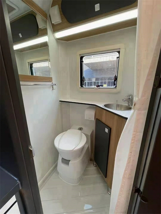 中部的会客区是本车亮眼的一部分 。 因为本车采用后车门设计 , 为会客区拓展了额外的空间 。 会客区不仅拥有双人对坐卡座 , 还有一排的单排沙发 , 将内部空间利用到了极致 。 驻车时 , 单排沙发可以向外拓展 , 变成一张舒适的双人沙发床 。