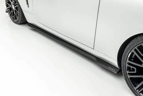 侧身部位MANSORY尽可能保留了曜影原本的精简干练风,但作为无碳不欢的“碳纤之王”,MANSORY依旧对翼子板、侧裙、A柱覆盖装饰件、后视镜罩、可折叠车顶棚、出气口分流器等部位进行了“碳化”处理。令人意外的是,就连分布在曜影前翼子板两侧的雕刻徽章标志,也全都用带底漆的可视碳纤维材料作了更替。在MANSORY的定制理念里,不论多容易被忽略的微小部件也都足以成为彰显品牌魅力的优秀“载体”!