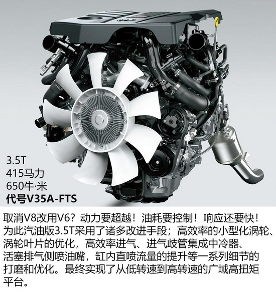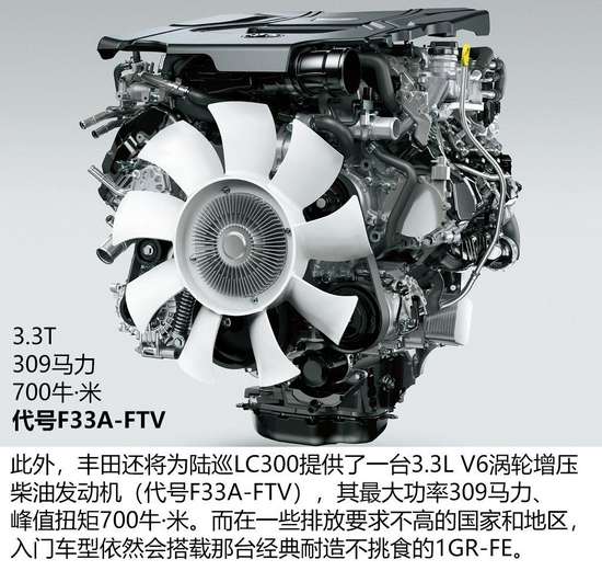 两款根据TNGA平台全新开发的 V6 双涡轮增压发动机(3.5L汽油和 3.3L柴油)在性能表现上得以实现对传统V8发动机的超越。汽油的3.5T V6版本(代号V35A-FTS)拥有了415马力的功率,扭矩650牛·米,0-100km/h的加速成绩为6.7秒!(又一台猛犸象)另一款则是柴油的3.3T V6发动机(代号F33A-FTV),最大功率309马力,扭矩达到了700牛·米。两套动力系统都将搭载10AT自动变速箱。