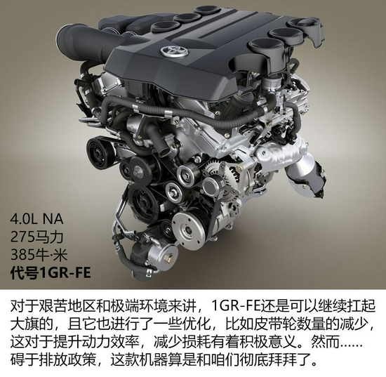 除此之外,在一些对排放要求不高的地区(和我们彻底说再见了),LC300继续提供那台“经典超抗造不挑食”的1GR-FE 4.0L V6发动机,最大功率275马力,最大扭矩385牛·米,匹配6AT变速箱。