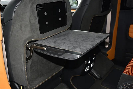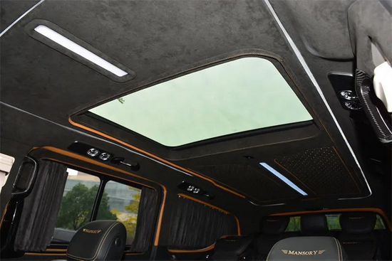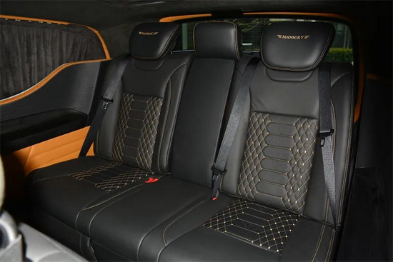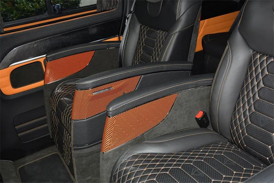 此外,由Alcantara环保麂皮绒包裹的地毯、门框、内壁、小桌板、顶棚等区域,以及随处可见的与车外遥相呼应的金线碳纤维元素饰品,完美烘托出内舱精雅氛围的同时,也将MANSORY迈莎锐三十年不变的匠心工艺充分展现到世人面前。