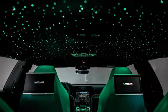 Alcantara环保麂皮绒打造的唯美浪漫RGB流星星空顶,与外部粗犷身姿形成鲜明反差;对比原厂车顶,这种面料具有:无毒、无味、无害的特性。或许只有MANSORY迈莎锐这种改装“艺术家”才愿意如此大面积地启用这面料里的“爱马仕”。