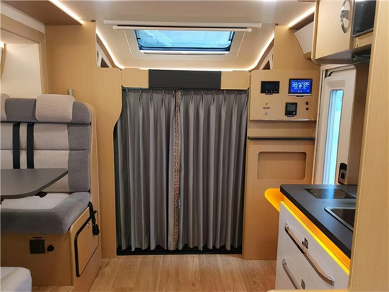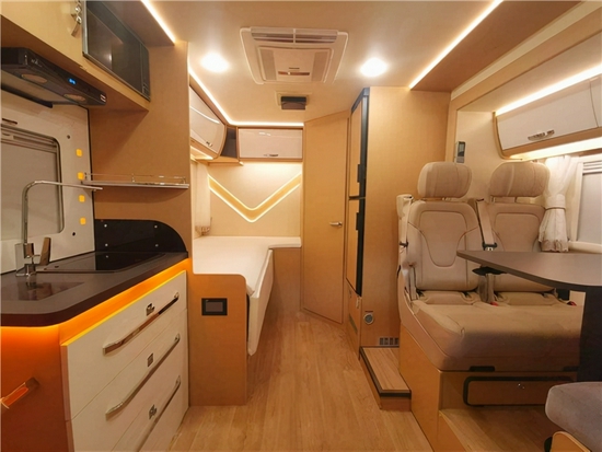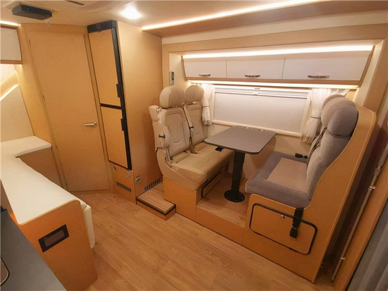 会客区四座座椅采用对坐式设计,使用奔驰V-CLASS (配置|询价)原厂座椅,座椅上方带有国际通用的儿童座椅插口,十分贴心。车内配备进口壁挂型餐桌、可以上下调节拼合成床,可供日常休息使用。左侧顶部吊装组合储物柜、氛围灯、顶部LED照明灯等。外推窗和纱窗,保护隐私的同时带来足够的采光及空气流通。