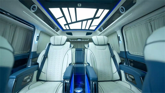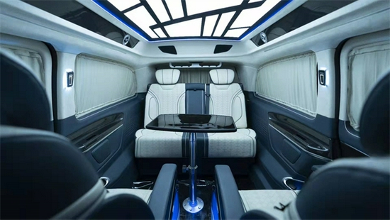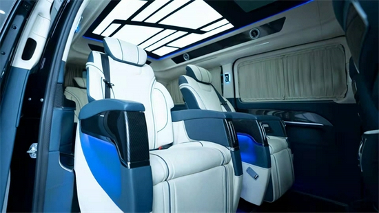 对于一款奔驰精装修的商务车,他体现的就是乘车舒适,那仅仅把底盘升级成空气悬挂是远远不够的,座椅也是重中之重,带触屏的航空座椅,不用低头弯腰就能调节任意角度,激光打孔的真皮包袱,涵盖了通风,加热,按摩等功能,配合顶部灯组,以及吞噬感极强的扰流设计,都彰显着它的豪车风范。