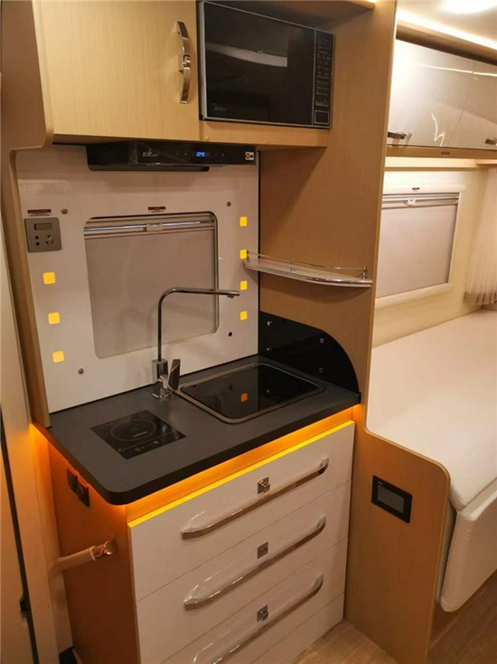 厨房区域配备了800w电磁炉,油烟机,微波炉,带盖水槽,高脚水龙头,会客厅后方装配了152L赛特福德双开门冰箱,至少足够一家三五天的食物需求,车外也配备了抽拉式柴油灶,比之燃气灶更加安全方便。绝对可以满足大多数做饭需求。