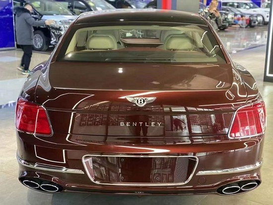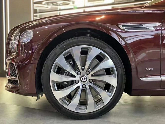 作为首发限量款车型,实拍车型配备的是规格为275/35 R22的轮圈(标配21寸,可通过宾利定制部门Mulliner升级定制),多辐式铝合金轮毂造型并不复杂,但放在这里却显得非常大气,配合着前六后四的深灰色刹车卡钳和尺寸很大的刹车盘,带来不错的运动氛围。轮胎匹配的是倍耐力王牌产品P ZERO系列,抓地性能出色。