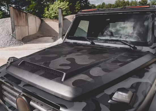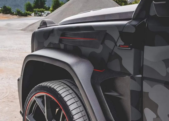 放大MANSORYG63 Star trooper细节可以发现诸如:车头引擎盖带进气口、前保险杠、顶部探照灯、翼子板、轮眉、侧裙、扰流、门把、后视镜盖、后置扩散器、后保险杠、备胎罩等区域皆以锻造碳形态呈递。迷彩碳纤维带来的视觉效果狂野激情,散发出阵阵热血魂动的战斗气息。