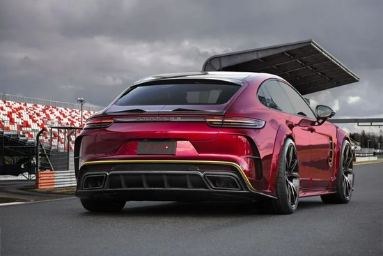MANSORY为Panamera前后包围都做了拓宽处理。后杠两侧牺牲了原厂车型的饱满圆润,以一种硬朗凌厉的运动之风取而代之。固定式的碳纤大尾翼,搭配碳纤维后保杆、后置扩散器和设计感极佳的方形排气管,使得这款Panamera整体外观更加趋于运动。