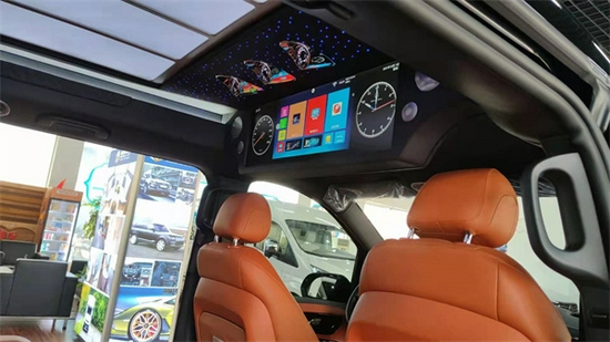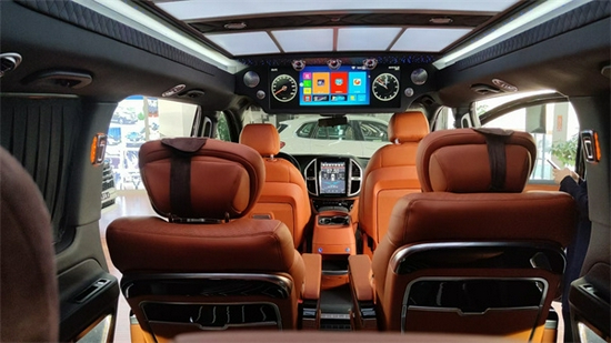 顶部28寸半隔断互联网电视,下方小吧台带触控屏灯光的一键控制,非常便捷,独立的办公桌板更好地为您提供办公用途,米色的超纤真皮与橡木的点缀,无时无刻都在彰显他的豪华非凡,车顶覆盖光纤顶灯和意大利进口Alcantara麂皮,整车覆盖超纤皮革。进一步提升整车的豪华性。