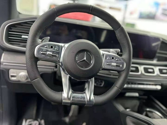 21款奔驰GLE53AMG高性能方向盘 AMG高性能方向盘由黑色Nappa皮革包覆,将多功能、高品质触感和完美人体工程学设计融于一体。 方向盘还带有AMG Drive Unit操控单元,让驾驶者得以快速准确地操作各种动态驾驶功能。