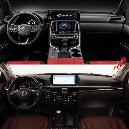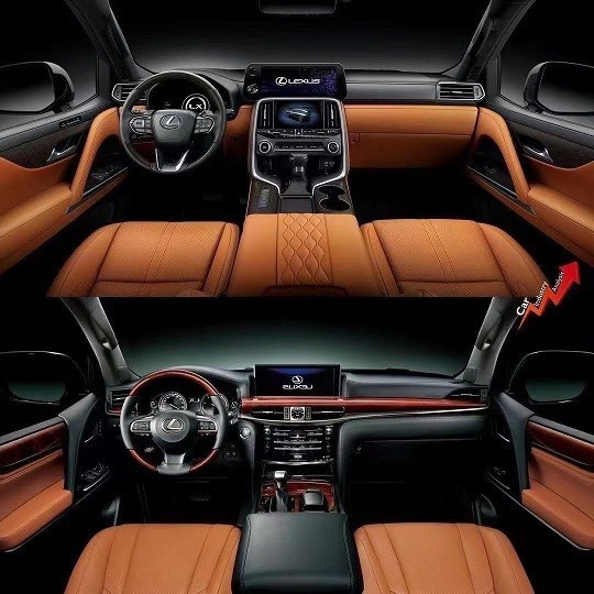 全新LX的内饰更加精致,棕黑配色和菱格缝线处理相得益彰。造型并没有照搬全新丰田兰德酷路泽,中控多媒体屏幕分为上下两个,尺寸分别为12.3和7英寸。遗憾的是,时下流行的全液晶仪表再次缺席,在一定程度上降低了新车的科技感。