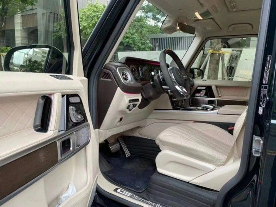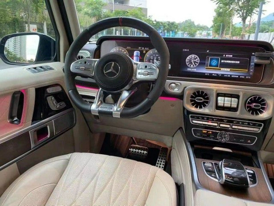 此外,G500最大的轮圈尺寸,进一步提升了它外观造型的彪悍程度。展车不仅采用了全新的车身涂装,还搭配了红色的轮圈装饰,更加个性。 2021款奔驰双12.3英寸高清屏,虚拟仪表盘与中控液晶屏融为一体,视觉上形成一个宽屏驾驶舱,中部的涡扇式空调出风口也颇具设计感,还大量采用了皮革的包覆。