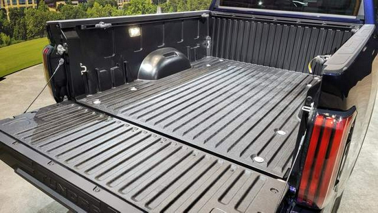 在后面,有一个全新的后车斗,带有铝制横梁。它从Tacoma 中的车斗汲取灵感,其结构使车斗重量更轻,并提供更好的防凹痕和防腐蚀保护。这个车斗看起来比较普通,配有灯源和120V 电源插座,可以为电动工具充电。