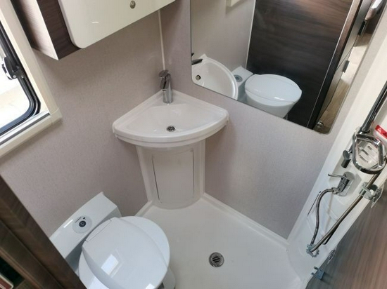 整体式卫生间,各项配置很齐全,淋浴花洒、热水器、洗手池、储物柜以及抽拉盒式马桶、集成式卫浴系统一应俱全,黑水箱18L。