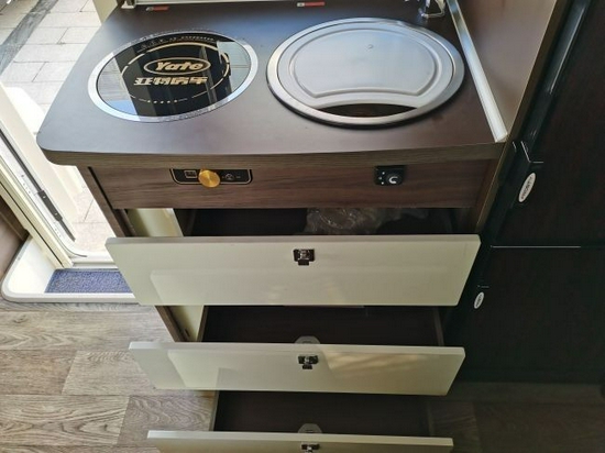整车内饰的前部,设计了一个多功能额头床,停车休息的时候把床板放下,一张2300*1400的双人额头床就出现了。掀起额头床,我们在下方内嵌了一个19寸智能电视,在旅途中看看电视放松一下是绝佳的选择。厨房区域配备了1200W电磁炉。高弯水龙头和带可移动盖的高档不锈钢水盆,该车还配备了外置抽拉柴油灶。下方还设计了三层储物柜,可以放置厨房用品。顶端也设计储物柜。