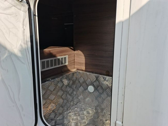 副驾驶一侧从前到后依次是方形储物舱、燃气罐舱、污水箱,德国进口房车专用门和合世壁双层亚克力保温车窗。车中门玻璃区域配置有隐私帘,很好的保障了车内人的隐私。车辆标配了电动踏板以及手动的3米遮阳棚,也可选装电动收放的版本。