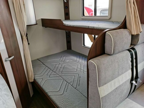 车尾是纵置的上下铺设计,可睡下2-3个人,加上沙发床、额头床,整车睡下5个人,还是轻轻松松的,满足5座5卧。整车采用咖色布帘,营造一种简约居家的舒适感。