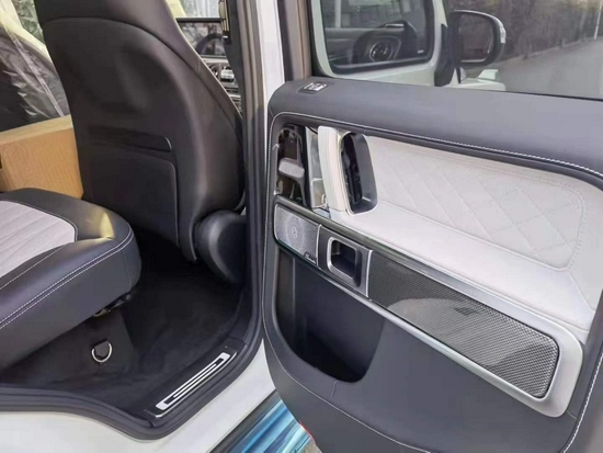 奔驰G500采用了奔驰最新的双屏幕式设计,全液晶仪表盘和中控台屏幕都达到12.3英寸。同时内饰质感和工艺都有了很大的进步。后排乘客的纵向乘坐空间增加150mm,更好地保证第二排乘客的舒适性。新车入门级标配7扬声器的音响系统,提供16扬声器的柏林之声音响系统可选。