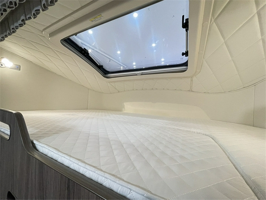 额头上的固定床: 上翻是电视,可以在后面日常看电视看电影,家一般的感觉。放下来即可形成2100×1170mm额头大床,空高650mm,带曲面透气大天窗,晚上床上数星星也是非常惬意的生活,雨天静听雨水拍打的窗户,别有一番意境。尾部横置床: 1900×1250的固定双人床。窗帘一拉,一个睡觉空间就此形成。前后两个横置床都是属于双人床系列,空间大,尺寸足,分别可供两个成年人日常休息。