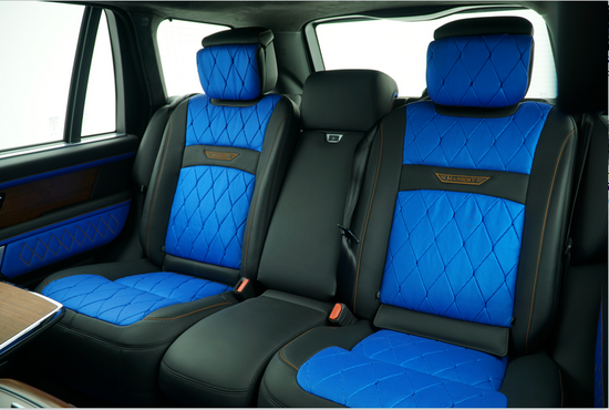 MANSORY Landrover揽胜内饰部分同样吸引人:蓝黑双重配色与车外遥相呼应,实木材料、碳纤维元素、意大利Mastrotto小牛皮、Alcantara环保麂皮绒相辅相成,交混包覆带来的视觉享受直击心灵;椅面菱形纹路细针密缕,奢华典雅显露无余。