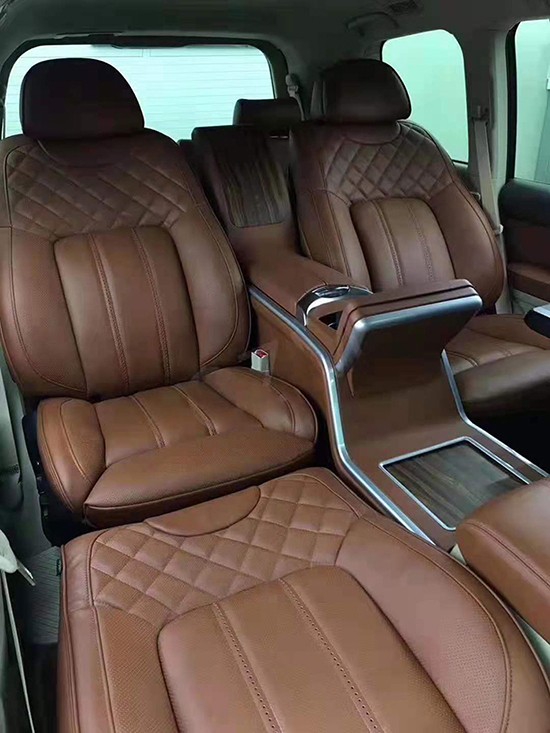 取消腿托变成延长座垫后,主副驾的靠背往后打下来也能接上中排,形成一张临时休息的床,并且中排的航空座椅也可以往后倒下,这样即使在长途里也能提供一个良好的休息空间,毕竟原车的靠背比较笔直,不适合长途使用,中排靠背可以往后调节180°才能乘坐的更为舒适。