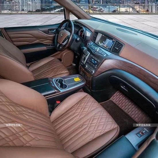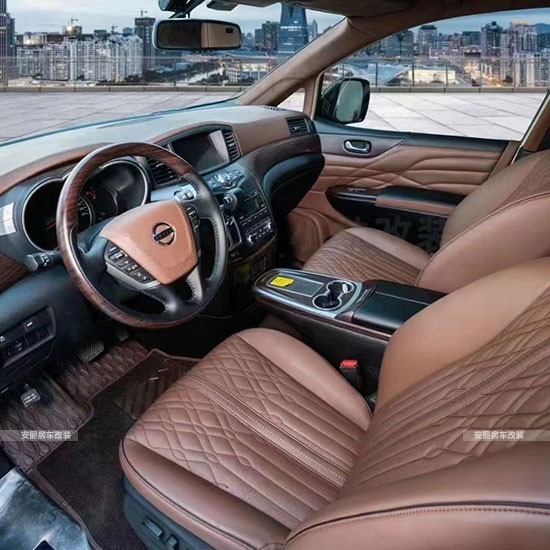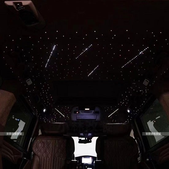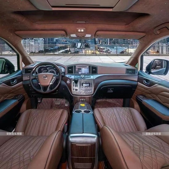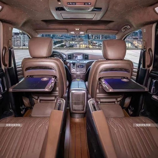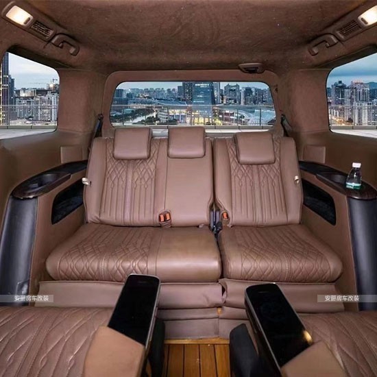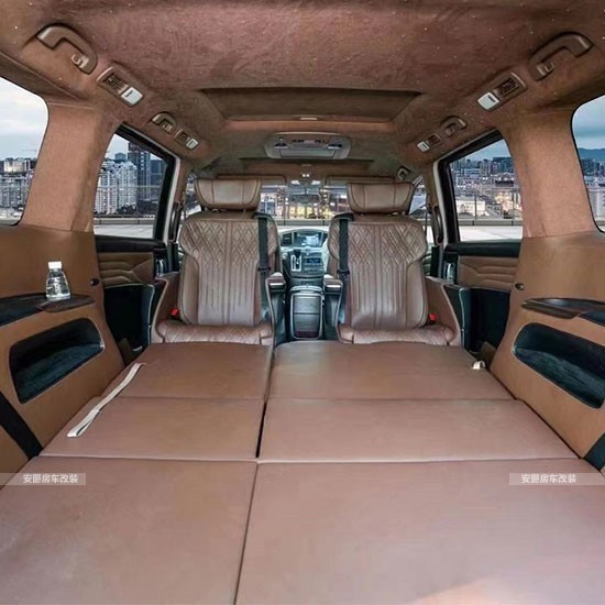 改装项目清单: 航空座椅、三连座沙发、柚木地板、全隔断、带升降电视、半隔断吧台、吧台隐藏座椅、电动中门、电动尾门、导航、桃木方向盘、方向真皮包、覆仪表台真皮包覆、驾驶座真皮包覆、驾驶座电动调节、驾驶座电动加热、驾驶座电动通风、驾驶座电动按摩、驾驶座气动按摩、驾驶座加棉、驾驶舱鹿皮顶、后舱鹿皮顶、后舱星空顶、九宫格顶灯、ABCD柱鹿皮包覆、遮阳板鹿皮包覆、驾驶位门板真皮包覆、中门门板真皮包覆、后尾门门板真皮包覆、全车侧壁真皮包覆、全车私密手动窗帘、迎宾踏板、主副驾驶中央扶手箱、主副驾驶扶手带冰箱、吸顶电视、主副驾驶靠背小桌板、可拆卸桌板车、内氛围灯、吊顶等等。