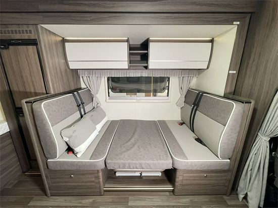 额头上的固定床: 上翻是电视,可以在后面日常看电视看电影,家一般的感觉。放下来即可形成2100×1170mm额头大床,空高650mm,带曲面透气大天窗,晚上床上数星星也是非常惬意的生活,雨天静听雨水拍打的窗户,别有一番意境。尾部横置床: 1900×1250的固定双人床。窗帘一拉,一个睡觉空间就此形成。前后两个横置床都是属于双人床系列,空间大,尺寸足,分别可供两个成年人日常休息。